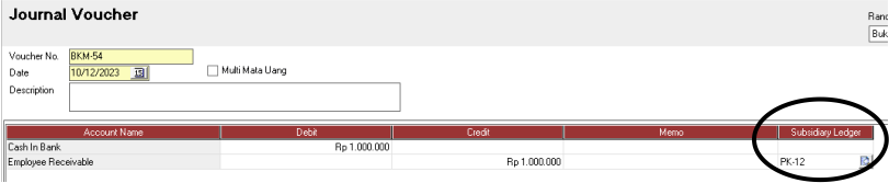 Tapi bila pencatatannya menggunakan Modul Bukti Jurnal Umum, maka ketika memilih akun Employee Receivable ( sebagai akun bertipe Piutang ) maka otomatis formulir Jurnal Umum akan menambahkan kolom baru yaitu kolom Subsidiary Ledger yang digunakan untuk mendefinisikan Nama-nama Pelanggan Piutang Karyawan. Dan pilihlah nama pelanggan Piutang Karyawan yang sesuai dengan transaksinya